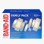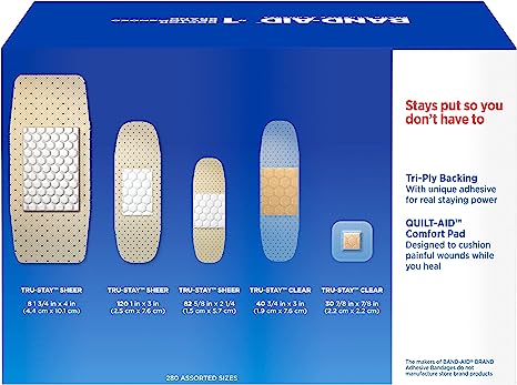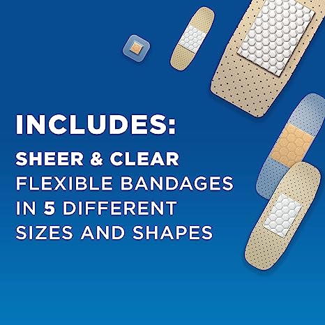 - 280 count box of Band-Aid Brand Sterile Adhesive Bandage Family Variety Pack includes sheer & clear flexible bandages in 5 different sizes and shapes. Covering minor cuts, scrapes & burns protect you against dirt & germs that may cause infections