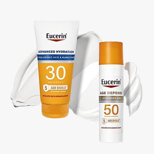 - Includes one (1) 5 fluid ounce tube of Eucerin Sun Advanced Hydration SPF 30 Sunscreen Lotion & one (1) 2.5 fluid ounce bottle of Eucerin Sun Age Defense SPF 50 Face Sunscreen Lotion